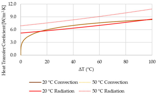 The heat transfer by convection changes minimally if the ambient air temperature should be changed only by tens of degrees. Change in radiative and convective heat transfer coefficient are shown in Figure 9. The convective heat transfer coefficient was calculated for fins’ length of 50 mm and the radiative heat transfer was calculated for emissivity of 0.95.