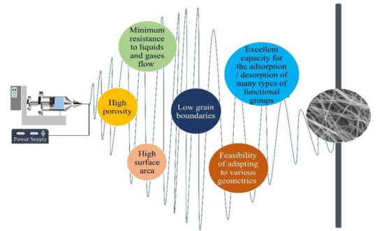 Electrospun NFs have many outstanding characteristics that make them promising catalytic materials. Some of the properties of electrospun NFs are shown in Figure 1. Contrary to NPs, a mesh of fibers is self-supporting, and its high porosity and other characteristics provide several reaction sites. The stable structure of the nanofibrous membrane ensures a consistent and predictable reaction rate and poses minimum issues of the agglomeration of the catalytic material [10].