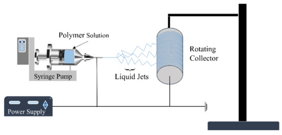 Historically, several methods have been applied to produce fibers of different dimensions. These methods include drawing, self-assembly [26,27], phase separation [27,28], template synthesis [27], and electrospinning (ES) [9,29,30,31,32,33,34,35]. Each production technique has its merits and demerits, and ES has been acknowledged as one of the most effective techniques to produce polymeric and ceramic fibers [9,31,35,36,37,38]. ES is cost-effective and can fabricate fibers continuously. This process fabricates fibers with controlled dimensions and desired structures. The diameter of the produced fibers can be achieved on the nanometer scale. The ES device generally comprises a reservoir of polymer dispersion solution with a pump, high-voltage source, nozzle, and conductive collector, as shown in Figure 2.