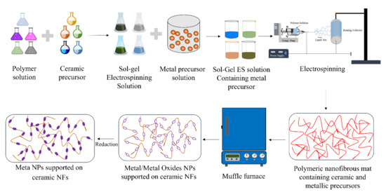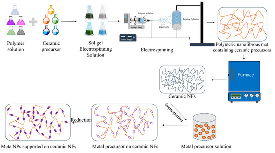 The ceramic NFs can be utilized directly as catalysts or catalytic supports, depending on the reaction. To support catalytic metals or metal oxide NPs on the surface of ceramic NFs, the particles can be added to the sol–gel solution before ES, as shown in Figure 3. This technique uses the ES method as the primary method to fabricate the ceramic-supported catalysts. The metal precursors must be soluble in the sol–gel solution to obtain well-dispersed catalysts. A strong attachment between the metal NPs and the ceramic NFs is usually obtained using this fabrication method. However, it is sometimes challenging to dissolve metal precursors in the ES solutions.