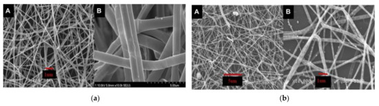 (a) (A) SEM; and (B) FE-SEM images of copper acetate (CuAc)/nickel acetate (NiAc)/PVA mat without heat treatment; (b) FE-SEM image of NiAC/CuAC/PVA mat NFs after sintering at 750 °C for 3 h in argon atmosphere. Reprinted from reference [54] with permission from Elsevier.