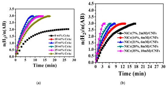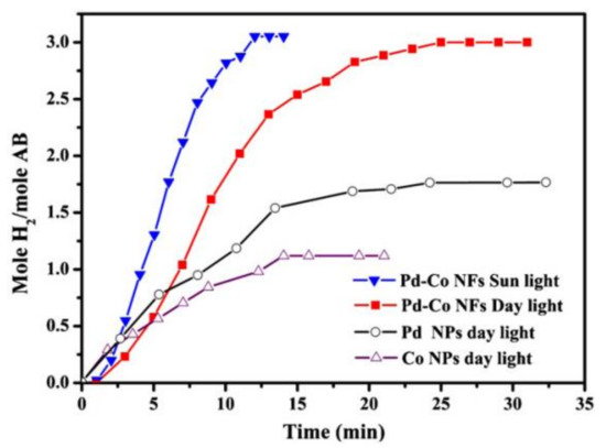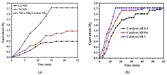 Yousef et al. have prepared a nonprecious nickel–copper (NiCu) nanorod-doped C NF (NiCu NRs/C NFs) catalyst for AB hydrolysis [54]. NiCu nanoalloy catalysts have been widely studied in various reactions such as fuel cell reactions. The nanoalloys have high catalytic and electrochemical catalytic activities [93,94].