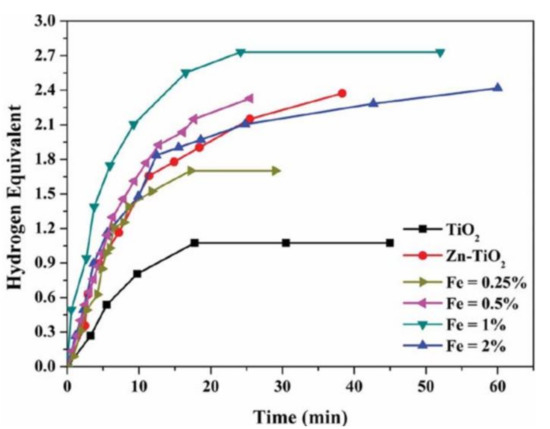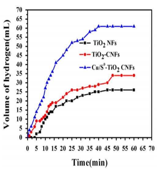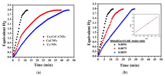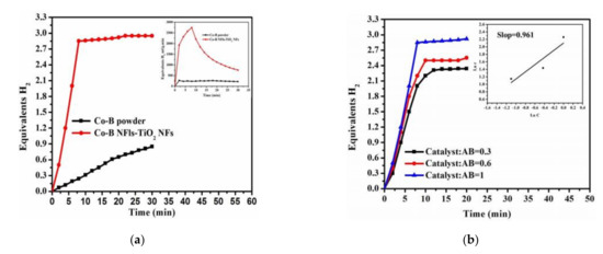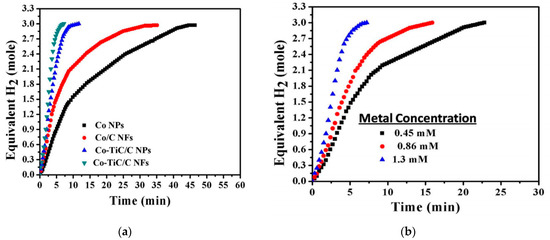 As shown in Figure 8a, Co–TiC NP-decorated C NFs showed very high activity with a maximum production of three equivalent moles of H2 in around 7 min. Co–TiC NP-decorated C NFs produced more H2 (0.4167) than Co/C NFs (0.25), Co–TiC/C NPs (0.35), and Co NPs (0.13 mol/min). The authors linked the high performance of the Co–TiC NP-decorated C NFs with the synergetic effects between Co and TiC. Even though the prepared NP catalysts have a greater surface area than the fibrous catalysts, the NFs generated more H2 due to the low grain boundaries on them that minimized the agglomeration affinity compared to the NPs.