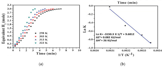 (a) Effect of temperature on Co-TiC/C NFs catalyst in hydrolysis AB reaction; (b) Plot of ln K vs. (1/T). Reprinted from reference [96] with permission from Elsevier.
