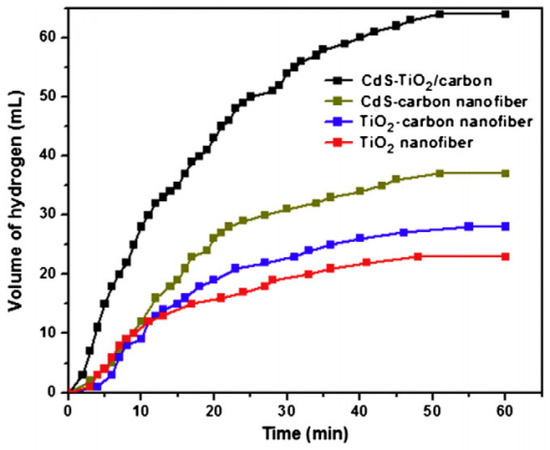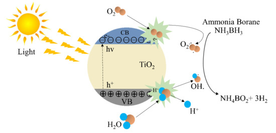 - Pant, B.; Pant, H.R.; Park, M.; Liu, Y.; Choi, J.-W.; Barakat, N.A.M.; Kim, H.Y. Electrospun CdS–TiO2 doped carbon nanofibers for visible-light-induced photocatalytic hydrolysis of ammonia borane. Catal. Commun. 2014, 50, 63–68. [Google Scholar] [CrossRef]
