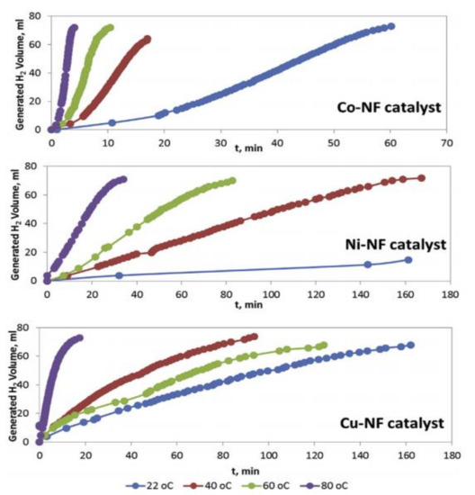 The authors also studied the effect of the catalyst concentration and temperature on the catalytic performance (Figure 8b). Higher catalytic concentration resulted in a reduction of the H2 production time.