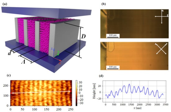 The fs IR laser source used for the DLW method produces the periodic relief structure at the surface of the polymer ribbons due to the interference of the incident writing beam with the beam reflected from the ITO layer. This surface relief structure is visible in Figure 1c, which shows the atomic force microscopy (AFM) image of the sidewall of a single ribbon. From the cross-sectional profile taken along the white line indicated in Figure 1c, one can see that the groove depth is around 20 nm, and groove periodicity is about 250 nm (Figure 1d). The presence of the surface relief on the sidewalls of the ribbons forces the nematic director n to be oriented along the grooves, so as to achieve a minimum of elastic free energy of the LC medium in contact with the grooves []. This interfacial interaction is described by the surface anchoring energy W. Our previous measurements performed with a single horizontally flipped ribbon gave a value W = 1.3 × 10−5 J/m2 [].
