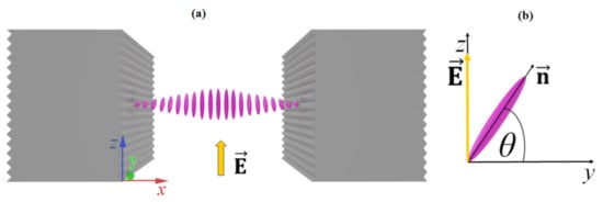 where fF is the Frank elastic energy density [], and the second term describes the coupling of n with external field E. The electric displacement vector D is related to the electric field E by , where is the dielectric tensor of LC and the external electric field is E = (0, 0, E). In accordance with Figure 2b, the free energy density is: