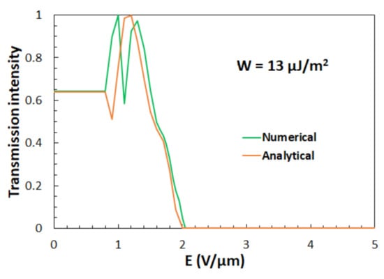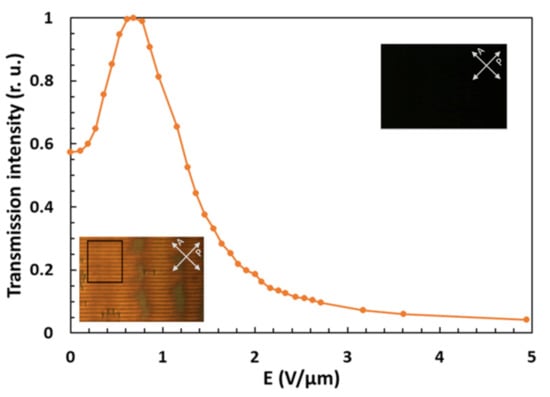 In the calculation of the transmission intensity, we used the thickness of the grating D = 8.45 μm (with the grating period Λ = 5 μm and the width of the LC slices w = 3 μm) [] and the wavelength of the illumination light λ = 550 nm, since white light was used in the experiment. Figure 6 shows the average transmission intensity as a function of the applied electric field E obtained for the anchoring strength W = 13 μJ/m2 []. A comparison of the results for which the values of θ(x) were determined numerically (green line) and analytically by Equation (10) (orange line) are given for E > 1 V/μm, while for E ≤ 1 V/μm Equation (13) was used.