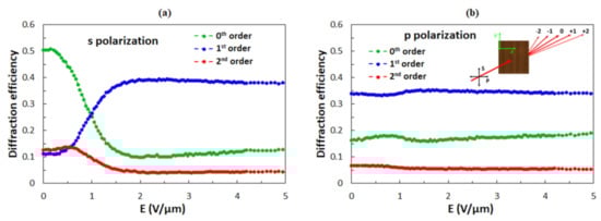 Optical diffraction was probed by a linearly polarized HeNe laser with the wavelength λP = 633 nm propagating along the z-axis (Figure 1a). The polarization direction was either along the grating lines (y-axis, s-polarization) or perpendicular to the grating lines (x-axis, p-polarization). The far-field intensities of the 0th (transmission direction), 1st, and 2nd order diffraction peaks were measured by photodiodes. The intensity of the higher-order peaks was more or less negligible. Figure 4 shows the experimentally measured dependences of the diffraction efficiency of different diffraction orders on the amplitude E of the applied external electric field for the s-polarized (Figure 4a) and p-polarized (Figure 4b) incident beam.
