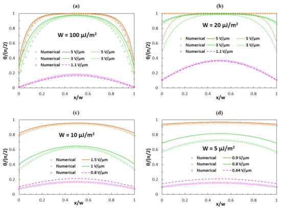 With further decrease of W, the difference between EF and E, above which θ(x) is everywhere equal to π/2, becomes lower and lower. The value of critical field E, above which θ(x) = π/2, for anchoring strengths W = 10 μJ/m2 (Figure 5c) is around 1.6 V/μm, and for anchoring strengths W = 5 μJ/m2 (Figure 5d) it is around 0.95 V/μm. For values of E (Figure 5c,d; brown colour) that are slightly below those critical fields, analytical results obtained by Equation (10) exhibit good agreement with the numerical results, while for values of E (Figure 5c,d; purple colour) that are slightly above EF, the analytical results obtained by Equation (13) exhibit a slight deviation from the numerical results. For example, for very low anchoring strengths W = 1 µJ/m2, the difference between the threshold field EF and the field E, above which θ(x) is everywhere π/2, is very small. The threshold field is EF ≈ 0.32 V/μm and the reorientation angle θ(x) is π/2 for electric fields E > 0.35 V/μm for numerical and analytical determination of the reorientation angle θ(x). Therefore, it is much more challenging to determine which approximation is valid for which electric fields.