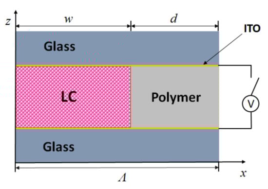 The width of the unit cell in the x-direction was Λ = 5 μm. The individual regions were defined by their thickness and respective relative permittivity for isotropic materials and by dielectric tensor for the anisotropic LC medium. For relative permittivity of the polymer medium, we took []. Since the external electric field E, oriented parallel to the z-axis, causes reorientation of the optical axis of the LC medium in the yz plane, the LC medium was described by a dielectric tensor: