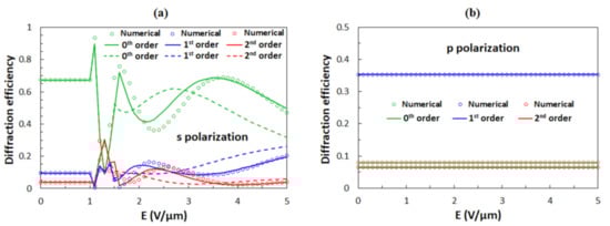 Diffraction efficiencies of the 0th, 1st, and 2nd diffraction orders as a function of the applied external electric field E for (a) the s-polarized and (b) the p-polarized incident beams. The anchoring strength is W = 100 μJ/m2. Circles are obtained with the numerical solution for θ(x), while solid lines are results for θ(x) obtained by Equation (9) and dashed lines for θ(x) obtained by Equation (10). In both analytical cases, for E ≤ 1.4 V/μm, results for θ(x) are obtained by Equation (13).