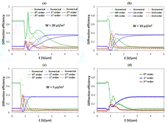 Figure 8 gives the numerical calculations of the diffraction efficiency η of the 0th, 1st, and 2nd diffraction orders as a function of E for the anchoring strength W = 100 μJ/m2. The curves for which θ(x) was obtained by Equation (9) are given as solid lines and those for which θ(x) was obtained by Equation (10) are given as dashed lines. In both cases, for E ≤ 1.4 V/μm, Equation (13) was used. One can notice that the analytical results for strong anchoring obtained by Equation (9) give better agreement with the numerical results than the analytical results for weak anchoring obtained by Equation (10). This is in line with the explanation in Section 3.2.