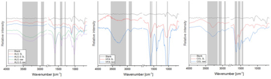 FTIR spectra of ALG, ALG-S, HYA, and COL thin films compared with the spectra of raw polymers and Si wafers. The characteristic bands are marked in grey, with the respective frequencies listed in Table 1 (spectra of the remaining polymers and thin films are available in the Supplementary Material, Figure S1). All carbohydrate samples show characteristic OH bands at about 3300 cm−1, with additional vibrations for CH and CO bonds. In addition, hyaluronic acid and chitosan show NH and CN vibrations, which are characteristic for amino groups. The protein samples show peaks for amide I, II, and III at polymer specific frequencies and additional vibrations for CH and CO groups. PLGA has a strong and narrow peak at 1750 cm−1, characteristic for its ketone groups, and additional peaks for CH and C-O groups.