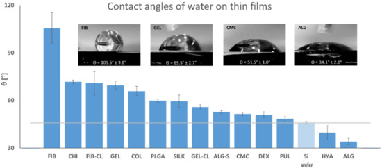 The hydrophilicity of thin films. Static contact angles were determined using the sessile drop method, depositing 1 μL droplets of ultrapure water and image capturing after initial contact. The results are summarized in the chart, with the average contact angle of water on clean Si wafers represented by the grey horizontal line. Images of water droplets on FIB, GEL, CMC, and ALG thin films are shown for comparison.