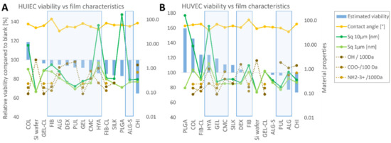 Estimated viability of HUIEC (A) and HUVEC (B) cells compared to thin-film characteristics. For improved legibility of the data, the values of the estimated viability were calculated by combining the results of the MTT assay and cell morphology into a biocompatibility score as shown in Figure 4 and further described in the Materials and Methods section. The estimated viability values are compared to thin-film characteristics (curves plotted against the secondary Y axis). The static water contact angle (yellow), roughness (green), and the number of functional groups (brown) are shown. Water-soluble polymers are marked with a blue frame.