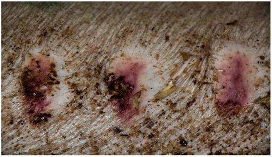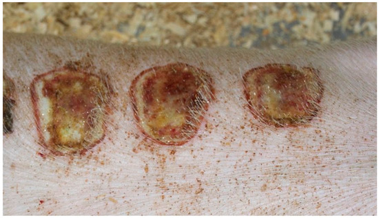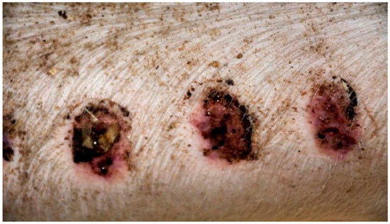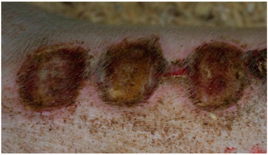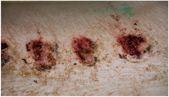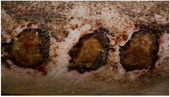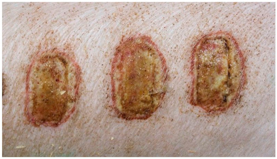 Then, for analgesia and anesthesia, thiopental was administered into the marginal vein of the ear at a dose of 5 mg/kg, fentanyl at a dose of 0.5 µg/kg, followed by making 18 identical burn wounds in each of the experimental animals; symmetrically distributed, 9 on both sides along the axis of the spine. A 3 cm × 1.5 cm brass block with a weight of 10 dag, heated up to 170 °C, was applied to the skin surface for 10 s. The total area of the burn wounds covered 90 cm2, i.e., about 2% of the body surface of the animal subjected to the experiment. During the procedure, vital signs such as ECG and saturation were monitored and, if necessary, respiratory support was used using a respirator.