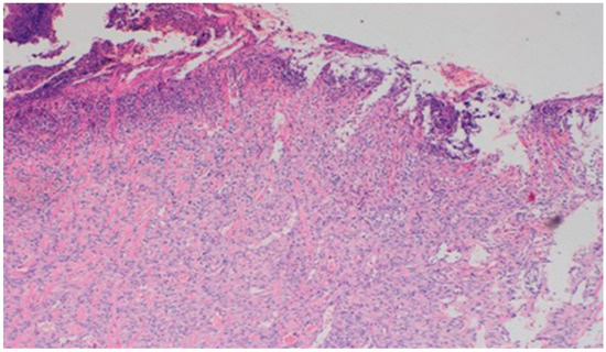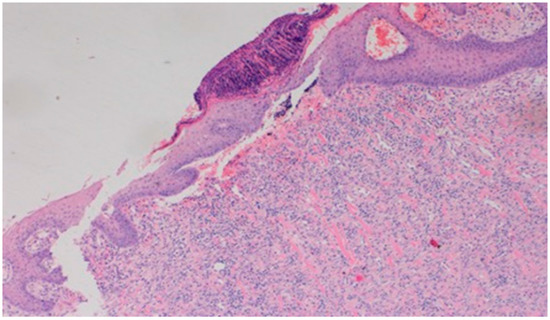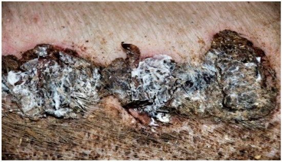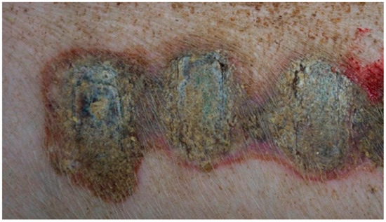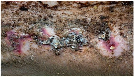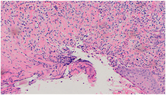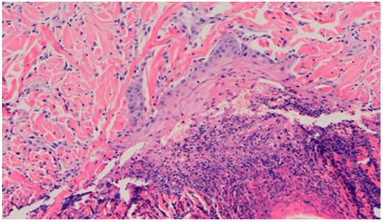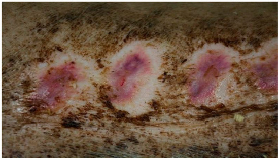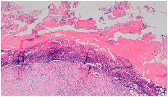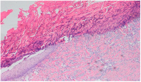 On day 15, the wound sections examined varied considerably, depending on the therapeutic agent used. The wound treated with the 1% propolis ointment was constantly characterized by slight epidermization and medium neovascularization, as was on day 10; however, the wound did not show superficial necrosis. In addition, the type of inflammatory infiltration changed to lymphocytic-granulocytic. The wound from the experimental group D2, treated with the 1% nanosilver ointment and the wound from the control group K, treated with sulfathiazole, constantly showed progression of inflammation, from medium to large. Wounds from the experimental group D2 and control K, on day 15 were covered with large superficial necrosis. The wound treated with the 1% nanosilver ointment showed high neovascularization with no epidermization. The wound from group D3, treated with a mixture of 1% propolis and 1% nanosilver, showed constant inflammatory infiltration of a medium degree, however, with a change in type on day 1 to lymphocytic-granulocytic. In addition, on day 15, the wound from the experimental group D3 was covered with small superficial necrosis, with medium-grade neovascularization. The wound showed no signs of epidermization. Clinical observations from day 15 are presented in Figure 5, Figure 6, Figure 7 and Figure 8.