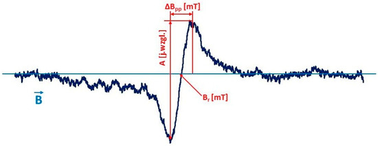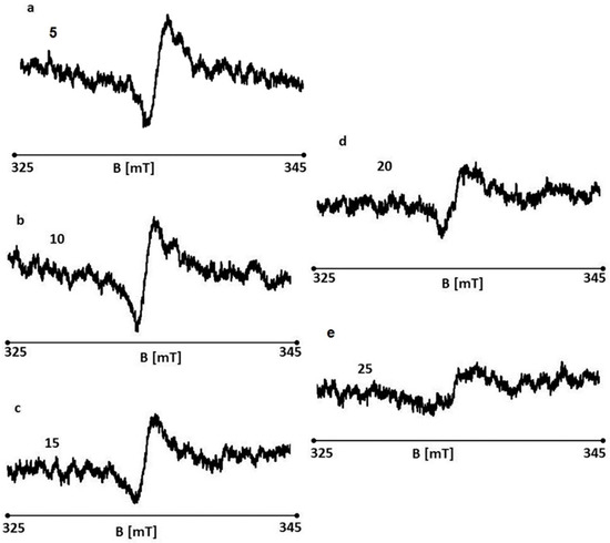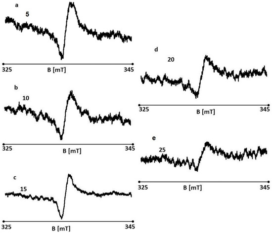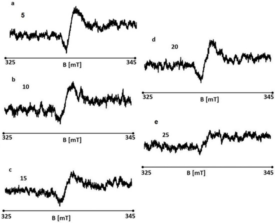 EPR spectra were recorded for wounds on days 5, 10, 15, 20, and 25 of treatment with the 1% propolis ointment. EPR spectra of the tested wound samples are shown in Figure 29a–e, respectively. EPR spectra were recorded at room temperature with a low microwave power of 2.2 mW (15 dB attenuation). The spectra of all the tested samples are broad asymmetric lines.