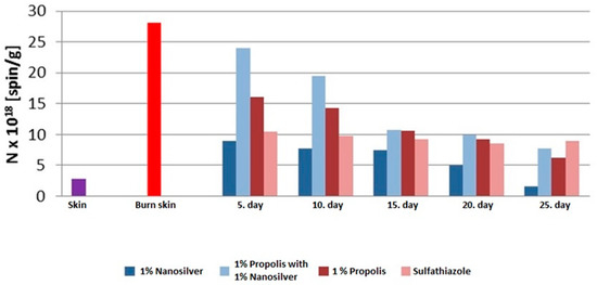 On day 25 of the treatment, the lowest concentration was seen in the wound treated with the 1% nanosilver ointment (1.6 × 1018 spin/g), and the highest in the wound treated with sulfathiazole (8.9 × 1018 spin/g).