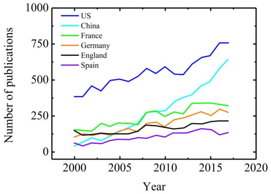Number of publications on rheology for US, China, France, Germany, England, and Spain from 2000 to 2017. Taken from reference [].