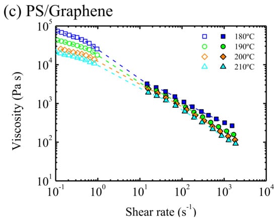 Viscosity as a function of shear rate for (a) PS, (b) PS/MWCNT, and (c) PS/PS/graphene. Open symbols correspond to data obtained with plate–plate geometry, whereas filled symbols correspond to data obtained by capillary extrusion rheometer []. The lines correspond to a modified Carreau Yasuda paper, see reference []; for Figure 2c, the discontinuous lines are to guide the eye. Reprinted with permission from []. Copyright 2016 The Society of Rheology.