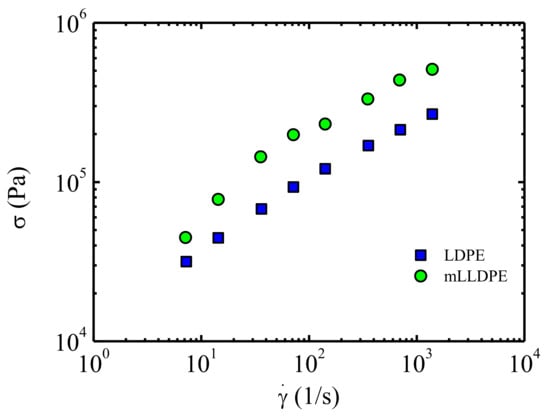 Flow curves of mLLPE and LDPE obtained by extrusion flow at 190 °C (“m” stands for metallocene-catalysed polyethylene; see text) [] Reprinted with permission from []. Copyright 2005 Elsevier Ltd.