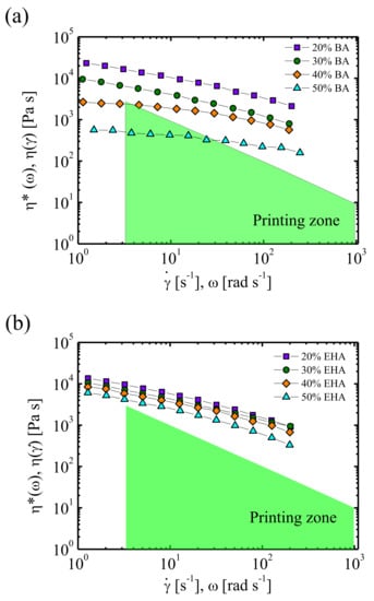 Complex viscosity versus frequency for PVC containing (a) poly(vinyl chloride-co-butyl acrylate) (PVC-BA) and (b) poly(vinyl chloride-co-2-ethylhexyl acrylate) (PVC-EHA) copolymers []. The printing zone is calculated modelling rheological conditions in the nozzle of the 3D printer Reprinted with permission from []. Copyright 2018 BME-PT.