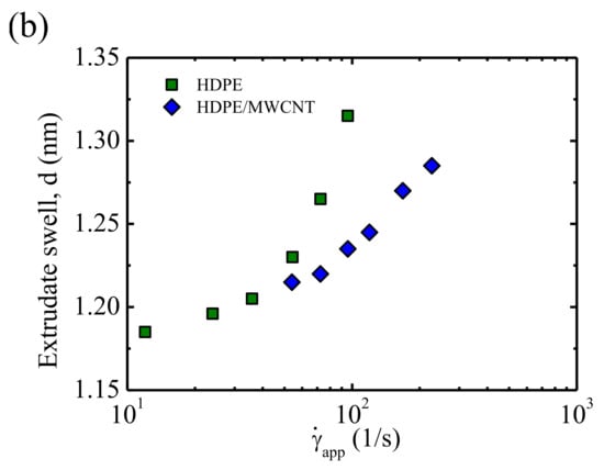 The alteration of the molecular parameters during processing, particularly in extrusion moulding, is the principal issue in the task of taking advance of recycled polymers. Rheological implications of recycling have been analysed by the Polymer Group of the University of Coruña [] for the case of poly(ethylene terephthalate), which is one of the most recycled thermoplastics. On the other hand, the rheological and mechanical properties of a biopolymer, Poly(lactic acid), reprocessed several times in a extruder, was investigated by Peinado et al. of the University of Zaragoza [].