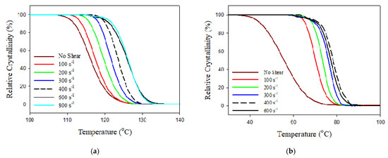 Temperature dependencies of conversion degree for (a) PBASGT and (b) PBAT specimens sheared for 45 s during cooling at 20 °C/min. The shearing with different rates in the range of 100–800 s−1 was initiated at 220 °C.