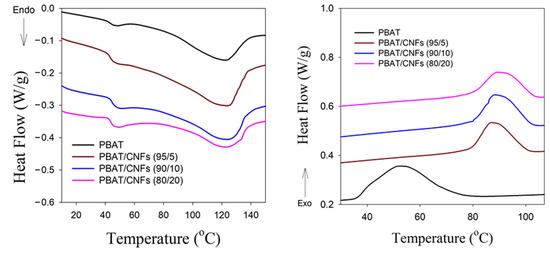 Melting endotherms and cooling exotherms of PBAT as well as PBAT/CNF blends with different concentrations of 5, 10 and 20 wt.% of CNFs.