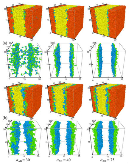 Figure 1 and Figure 2 show that the segregation of the triblock copolymer at the interface strongly depends upon the repulsion parameter . As the repulsion parameter = 30, although the system shows an obvious interface and most of the triblock copolymers aggregate near the interface between homopolymer A8 and B8, the interface of the blend is not very smooth (see Figure 1a,b with = 30) and the copolymers significantly penetrate the homopolymer bulk phase, as shown by the black solid squares in Figure 2a,b. As the repulsion parameter increases from = 30 to 40, all of the triblock copolymers aggregate at the interface of the ternary blends (as shown by = 40 in Figure 1), resulting in the increase in density of A + B beads of the triblock copolymers at the center of the interface (see the red solid dots in Figure 2a,b). However, as the repulsion parameter further increases from = 40 to 75, the morphology and the density of the triblock copolymers change slightly. These findings indicate that as the repulsion parameter is set to be = 40, the A8/A2B4A2/B8 and A8/A7B14A7/B8 ternary blends exhibit significant segregations, i.e., the two immiscible homopolymers are completely isolated by the copolymers, and almost all copolymers aggregate at the interface.