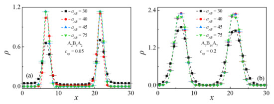 Density profiles of beads A + B of the triblock copolymer along the x-axis as a function of the repulsion parameter with (a) A2B4A2, ccp = 0.05 and (b) A7B14A7, ccp = 0.2.