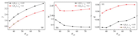 In order to quantitatively study the effects of the repulsion parameters on the interfacial properties of the blend’s materials, we calculated the interfacial tension , the interfacial thickness w, the orientation parameter q, the mean-square radii of gyration <Rg2> and the mean-square end-to-end distance <Ree2> at different repulsion parameter , as shown in Figure 3 and Figure 4. Apparently, the interfacial tension increases monotonically with increasing the repulsion parameter for the two blend systems, as shown by Figure 3a. This finding is consistent with the simulations of the An/Bm binary blends of Qian et al. [8] and the A2/A2B8/B2(B10) ternary blends by Guo et al. [1]. Helfand and Tagami predicted the dependence of the interfacial tension on the interaction parameters by SCFT for the interface of homopolymer/homopolymer in the limit of infinite chain length, i.e., , which indicated that the interfacial tension is proportional to [45]. In our simulations, Figure 3a also shows a larger interfacial tension of blends at ccp = 0.05. We inferred that the increase of the interfacial tension for this case with small copolymer concentration can be attributed to the distribution of copolymers beads, as illustrated in Figure 2a,b. It is shown that at the copolymer concentration ccp = 0.05, the density of the beads A + B of the triblock copolymers exhibits a decrease, which results in the enhanced correlations between beads of immiscible homopolymers. Figure 3b shows the interfacial width w of the A8/A2B4A2/B8 and A8/A7B14A7/B8 system. For the A8/A2B4A2/B8 system, as the repulsion parameter increases from = 35 to 55, the interfacial width w decreases, as the increases further to 75, the interfacial width w of the changes slightly. In the A8/A7B14A7/B8 system, as the repulsion parameter increases from = 35 to 75, the interfacial width w decrease first and then increases slowly. We inferred that the interface width w, which decreases first and changes slightly for the two cases with increasing the repulsion parameters , is related to the distribution of copolymers beads, i.e., as the density distribution of A + B beads of the triblock copolymer at the center of the interface is smaller, more A + B beads of the triblock copolymer penetrate the homopolymer phases, and this broader distribution of the triblock copolymer results in a larger interfacial width w.