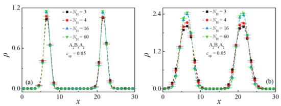 Density profiles of beads A + B of the triblock copolymer along the x-axis as a function of the homopolymer chain length with (a) A2B4A2, ccp = 0.05, (b) A7B14A7, ccp = 0.2.
