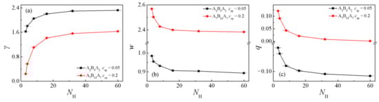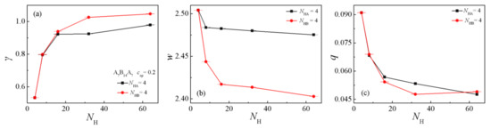 Figure 6a,b show the dependence of the interfacial tension and the interfacial width w on the homopolymers chain length NH, respectively. The obtained interfacial tension rapidly increases and the interfacial width w decreases with increasing the homopolymer chain length from NH = 3 to 32, whereas as NH increases from 32 to 60, both the interfacial tension and the interfacial width w reach a plateau. These results show that: (i) the ternary blend system with shorter homopolymer chain length exhibits a lower interfacial tension , which implies that the triblock copolymers compatibilizers show better performance in reducing the interfacial tension of the ternary blends with shorter homopolymer chain length. This is because that the shorter the chain length of the homopolymers can cause a wider interfacial width w (Figure 6b), which results in the decayed correlations between beads of immiscible homopolymers and the smaller the interfacial tension .