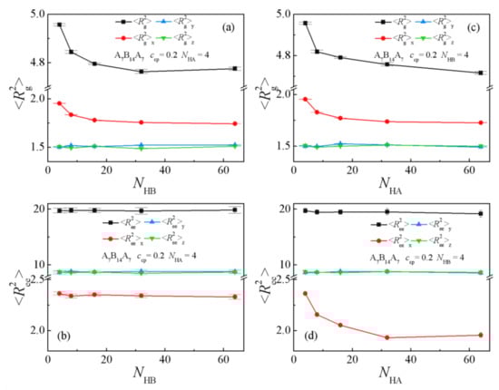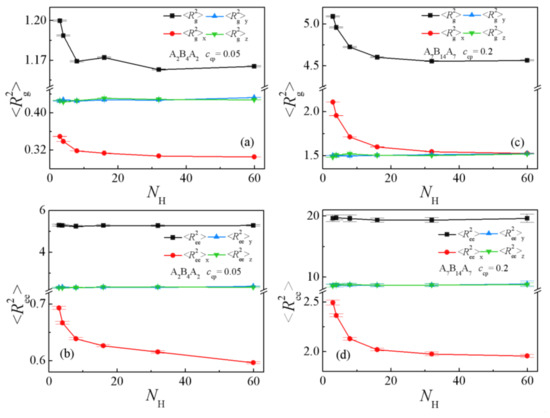 Figure 8c and Figure 9 show the chain orientation parameter q and the dimension of the triblock copolymers on the chain length of a single homopolymer component. The triblock chain orientation parameter q decreases with increasing homopolymer chain length NHA and NHB from 4 to 32, whereas as NHA and NHB further increase from 32 to 64, the q values of the triblock copolymers in both systems change slightly (as illustrated in Figure 8c). Figure 9 depicts the dependence of the dimension of the triblock copolymer on the chain length of a single component homopolymer. For the NHA = 4 system (see the solid line in Figure 9a,b), the <Rg2> and <Rg2>x of the triblock copolymers decrease with increasing homopolymers chain length NHB from 4 to 16, whereas as NHB increases from 16 to 64, the <Rg2> and <Rg2>x remain almost unchanged. For the NHB = 4 system (see the dotted line of Figure 9c,d), the variety of <Rg2> and the three components are consistent with the NHA = 4 system. Meanwhile, <Ree2>x decreases rapidly with the increase of homopolymer chain length NHA from 4 to 32, but as NHA increases from 32 to 64, the <Ree2>x almost remains unchanged. This implies that the increase of the homopolymer chain length NHA has a greater impact on the <Ree2>x, which is directly related to the construction of the triblock copolymer, i.e., the two end blocks of the triblock copolymer composed of A beads. The results can be interpreted as follows: as the chain lengths of homopolymers An are shorter and the chain length of homopolymers Bm is fixed to be NHB = 4, the distribution of the A end blocks of the triblock copolymers is broader, as illustrated in Figure S5d, which results in a larger value of <Ree2>x. By comparing Figure 9a–d with Figure 7c,d, we find that: (1) <Rg2>x is always larger than <Rg2>y or <Rg2>z for the NHA = 4 and NHB = 4 systems, whereas the three components of <Rg2> are almost the same as the chain length of the homopolymers NH > 32 for the NHA = NHB = NH systems; (2) for the system with NHA = 4, as NHB increases from 4 to 64, the <Ree2>x almost remains unchanged. These results illustrate that the stretch of the triblock copolymers depends on the chain length of the homopolymers, whereas <Ree2>x only depends on the chain length of homopolymers NHA, due to the structure of the triblock copolymers. Specifically, the two end blocks (composed of A beads) of the triblock copolymers segregate into the homopolymer An bulk phase (as illustrated in Figure 1). The increase in chain length of the homopolymer Bm cannot significantly affect the structures of A end blocks of the copolymers, and therefore <Ree2>x, <Ree2>y, and <Ree2>z almost remain unchanged.