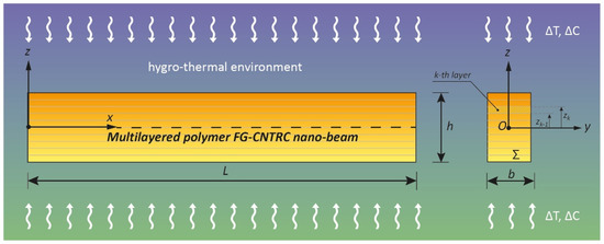 Consider a Bernoulli–Euler multilayered FG-CNTRC nano-beam of length “L”, with a rectangular cross-section (Σ) with thickness “h” and width “b”, as illustrated in Figure 1 where the principal axes of geometric inertia, denoted by y and z, originating at the geometric center O of Σ are also shown.
