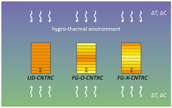 In particular, three different CNTs distribution schemes have been considered: a uniform distribution, indicated as UD-CNTRC, and two non-uniform functionally graded distributions, identified as FG-O-CNTRC and FG-X-CNTRC, respectively (Figure 2).