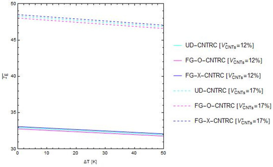 In particular, Figure 3 plots the curves of the above mentioned dimensionless bending stiffness, , versus the uniform temperature rise, , varying the temperature increase in the range [0, 50 (K)], the total volume fraction of CNTs in the set {12%, 17%} and considering the two non-uniform functionally graded distributions, FG-O CNTRC, FG-X CNTRC and the uniform distribution UD CNTRC, defined above (Figure 2).