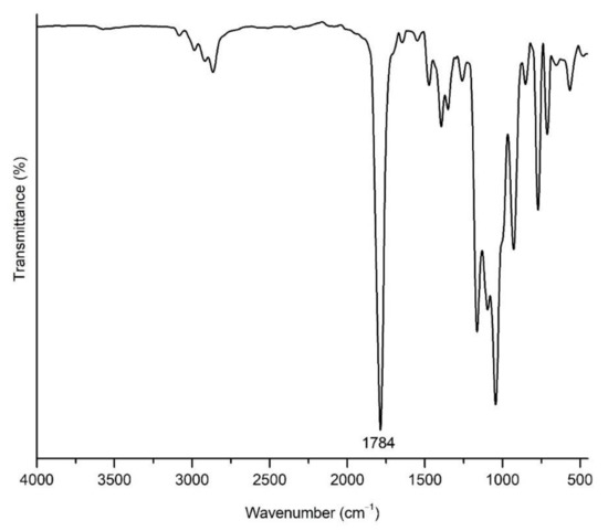 The AGC, which was used in the OBMI-St-AGC preparation (Scheme 1b), was synthesized in the laboratory as explained in the literature [26]. The FTIR spectrum of the obtained AGC sample is given in Figure 3. The peak at 1784 cm−1 belongs to the C=O bond of the cyclic carbonate group, and because the C=O bond of the diethyl carbonate peak appears at 1740 cm−1, it was concluded that the synthesis was successfully achieved by evaluating and comparing this spectrum with the literature [45].