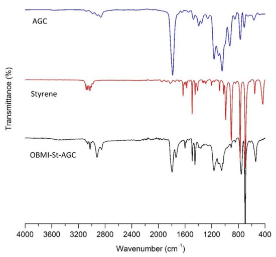 The FTIR spectra of AGC, styrene, and OBMI-St-AGC.