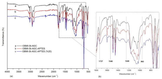 Additionally, in the comparison of spectrum a, b, and c in Figure 5, the change in the peaks’ intensity at the 1000–1200 cm−1 region is due to the incorporation of Si-O-C and CH2-Si by means of APTES, and the increase in Si-O peak intensity at 963 cm−1 is due to APTES incorporation [15,53]. These results showed that the APTES was successfully combined with the OBMI-St-AGC chain through the reaction of its NH2 with cyclic carbonate groups.