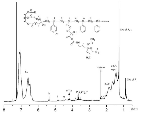 The representative structures of OBMI-St-AGC and OBMI-St-AGC-APTES are presented in Scheme 1c,d, respectively. The OBMI-St-AGC and OBMI-St-AGC-APTES samples are characterized by FTIR and 1H NMR analyses. These polymer samples were practically monomer free since they were purified by precipitation in methanol, as explained in Section 2.6 and Section 2.7. The FTIR spectrum of OBMI-St-AGC, AGC, and styrene are given in Figure 4, where the bands specific to styrene appeared at 1601 cm−1 (aromatic skeleton stretching of styrene),757 and 697 cm−1 (the pattern of five adjacent hydrogen atoms on the aromatic ring) [46,47]. The peak at 1795 cm−1 belongs to the C=O bond of the cyclic carbonate of AGC [48]. The C=O bond of oil moiety appears at 1737 cm−1 [49]. In comparison of the OBMI-St-AGC spectrum with the monomers spectra, the vinyl peak of styrene monomer at 1630 cm−1 [48] and the peaks at 997 and 928 cm−1 for allyl group of AGC [50] disappeared in the OBMI-St-AGC spectrum. These results showed that the free monomers were removed in the precipitation process, and the OBMI-St-AGC was successfully synthesized.
