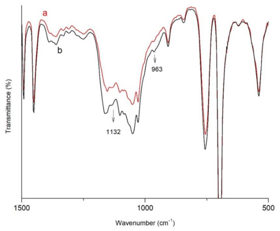 The FTIR spectra of OBMI-St-AGC-APTES and C-OBMI-St-AGC-APTES samples are given in Figure 8. The peaks corresponding to the Si-O-Si, C-Si-O, and Si-O-C stretching are shown at the 1000–1200 cm−1 region in the spectra. The increase in peak intensity at 1132 cm−1 shows Si-O-Si bond formation through the sol–gel reaction [58,59]. Additionally, the intensity of the peak at 963 cm−1 (Si–O stretching vibration of Si–OCH2CH3) decreased to some extent after the sol–gel reaction, which represents the precipitated crosslinked structure [15]. Another indication of the crosslinked structure formation is the insolubility of the sample in xylene.