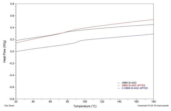 DSC thermograms of the OBMI-St-AGC, OBMI-St-AGC-APTES, and C-OBMI-St-AGC-APTES polymers are shown in Figure 10. The OBMI-St-AGC, OBMI-St-AGC-APTES, and C-OBMI-St-AGC-APTES samples exhibited a glass transition temperature (Tg) of 72.21 °C, 79.63 °C, and 92.4 °C, respectively. The C-OBMI-St-AGC-APTES sample showed remarkably higher Tg compared to that of the other samples. This is the expected result because the C-OBMI-St-AGC-APTES sample is obtained by the crosslinking of OBMI-St-AGC-APTES. In the literature, it was explained that the polymer samples showed higher Tg after silanization [60,61].