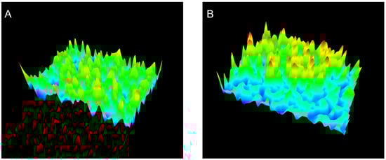 This increase in Ra for JR19F together with the reduction in crystal size may favor the solubility of JR19 in aqueous media, as the increase in Ra is directly related to the increase in the hydrophilic character of a material [46,47]. The 3D images of the films (Figure 3) confirm this difference in the surfaces between BF and JR19F, as evidenced by the greater number of valleys in the JR19F (Figure 3B) in relation to BF (Figure 3A), which is in accordance to the findings reported by Wanderley et al. [29].