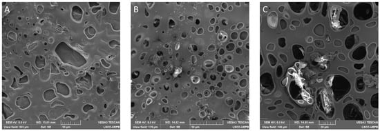 SEM micrographs of BF and JR19F. (A) BF (scale of 50 µm); (B) JR19F (scale of 50 µm); (C) JR19F (scale of 20 µm).