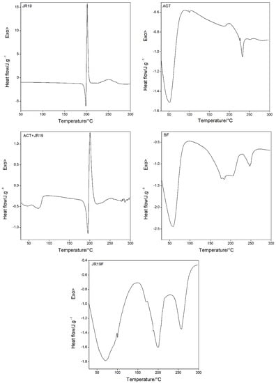 DSC curves for JR19, ACT, ACT + JR19 (physical mixture), BF and JR19F.